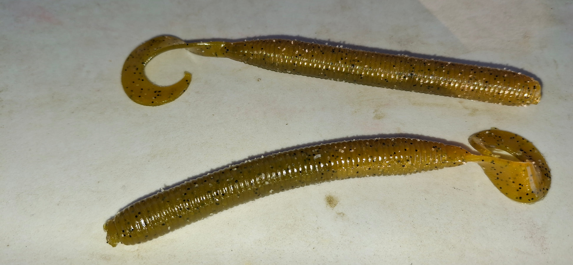 12 Pack of curly tail grub worms. The Green Pumpkin color pattern - Green PumpkingBrown with black flake. All of our soft plastics are salted and been through our multi-step hempseed oil process we call Canna-Lure!