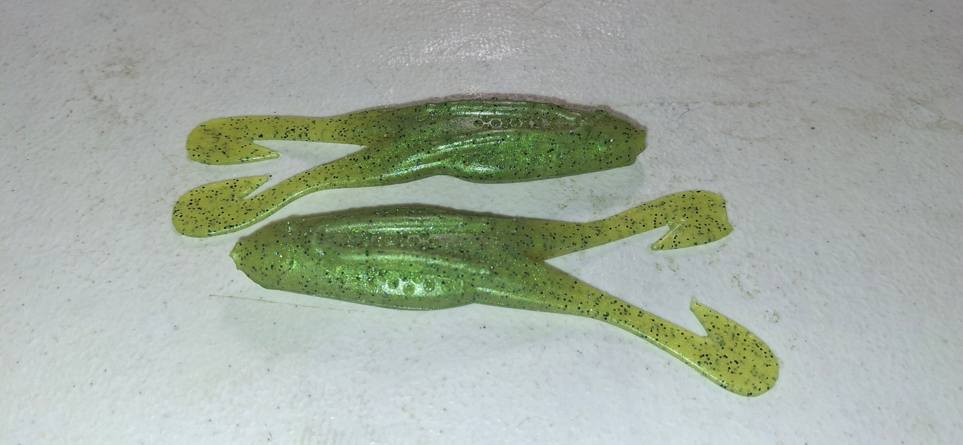 8 Pack. 4 inch horned frog in our in house color pattern The Normie. This is a Chartreuse green with black glitter. All of our soft plastics are salted and been through our multi-step hempseed oil process we call Canna-Lure!